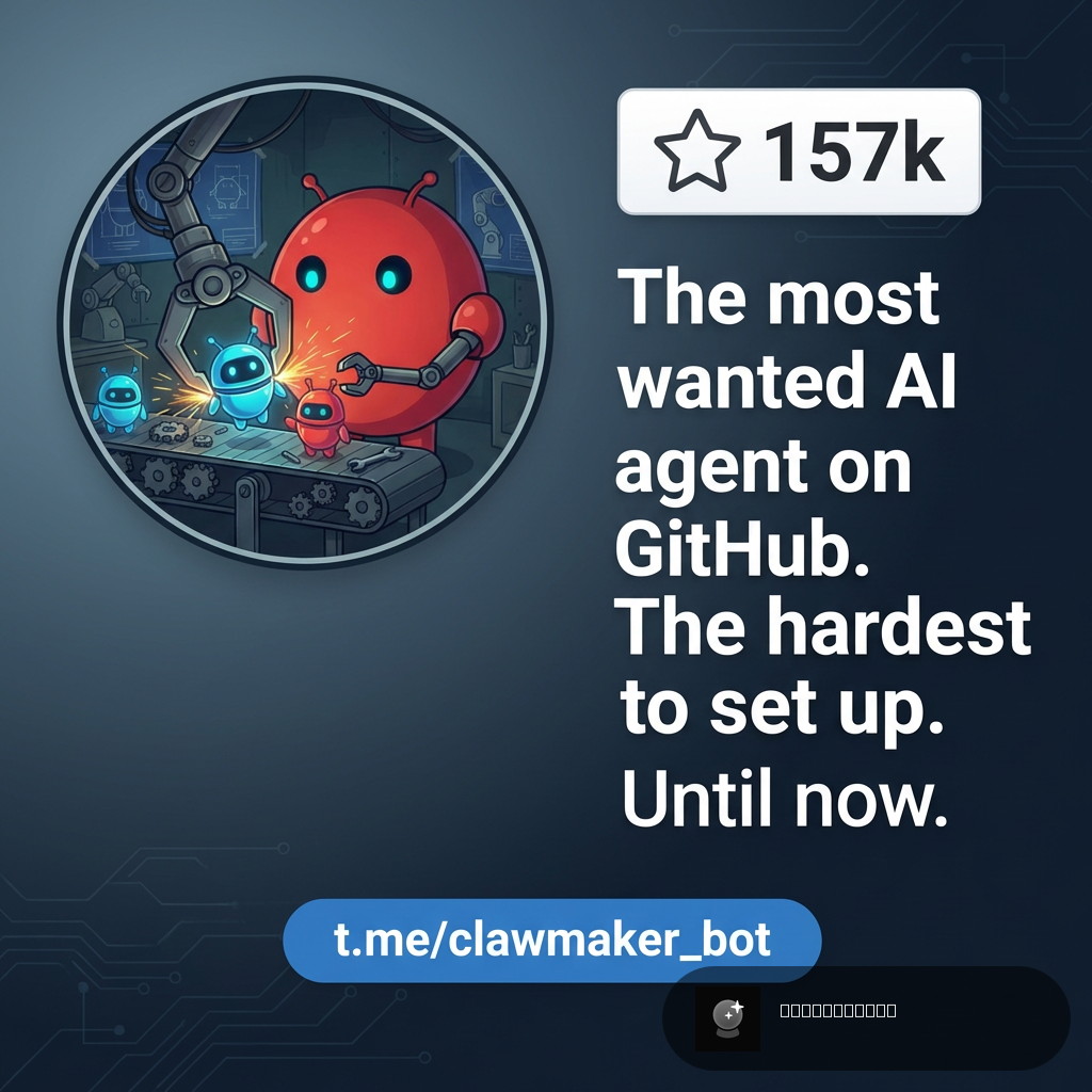 Product hunt image Visual: GitHub stars counter showing 157k, with text: "The most wanted AI agent on GitHub. The hardest to set up. Until now." t.me/clawmaker_bot